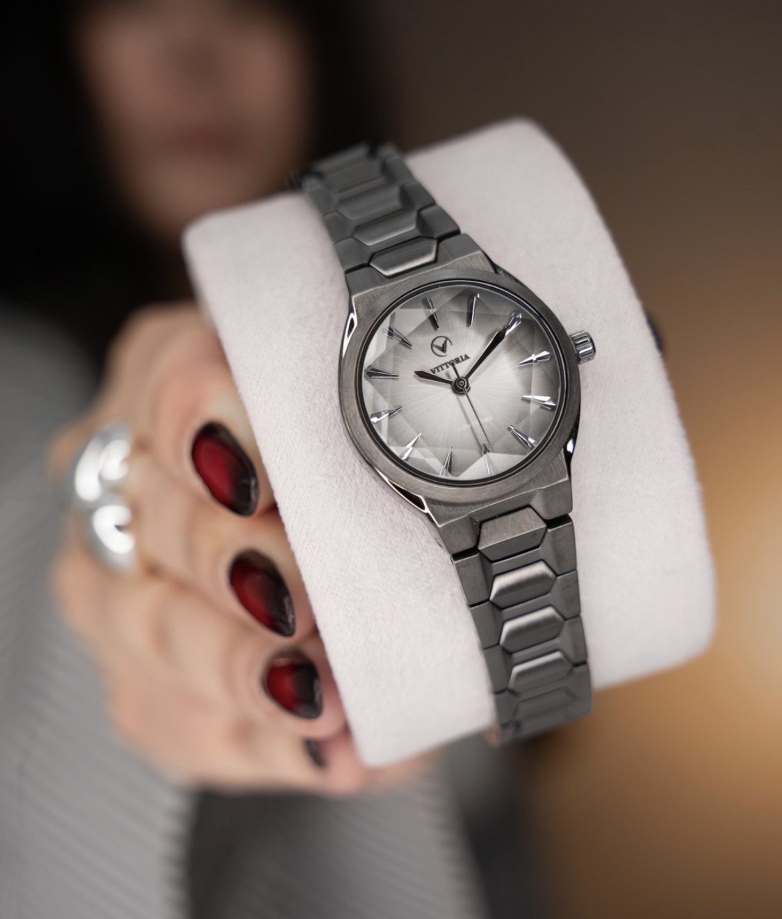 وقتی ظرافت با دقت و هنر در هم میآمیزد، نتیجه چیزی جز ساعت زنانه ویتوریا (Vittoria) نخواهد بود؛ ساعتی که نه فقط زمان را نشان میدهد، بلکه در هر ثانیه، داستانی از زیبایی، وقار و اصالت زنانه را بازگو میکند.